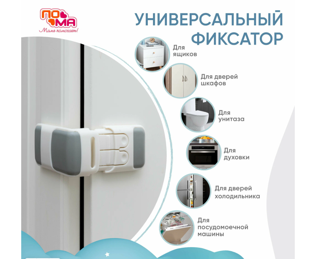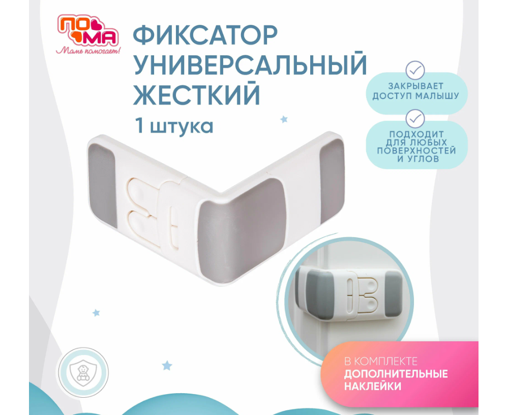 Прямоугольный фиксатор для тумбочек и шкафов закрывает ребёнку доступ к опасным для него предметам: аптечке, бытовой химии, косметике и прочему. Фиксатор крепится к деревянной, стеклянной, пластиковой и любой другой поверхности. Легко открыть его смогут только взрослые. В комплект входит дополнительный набор наклеек для повторного использования фиксатора.