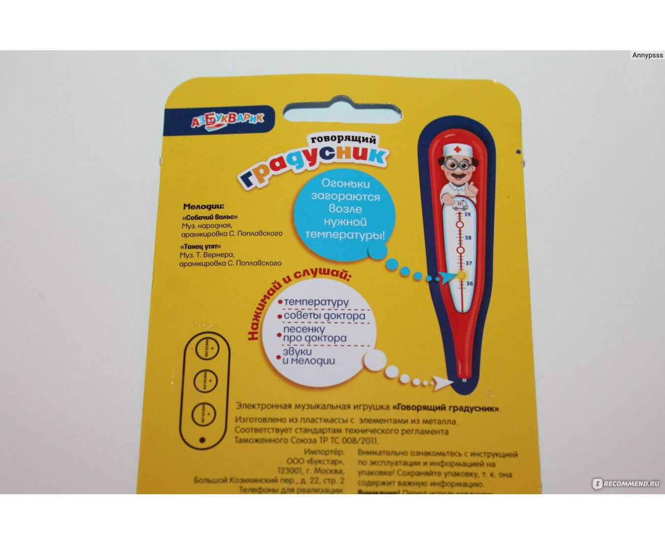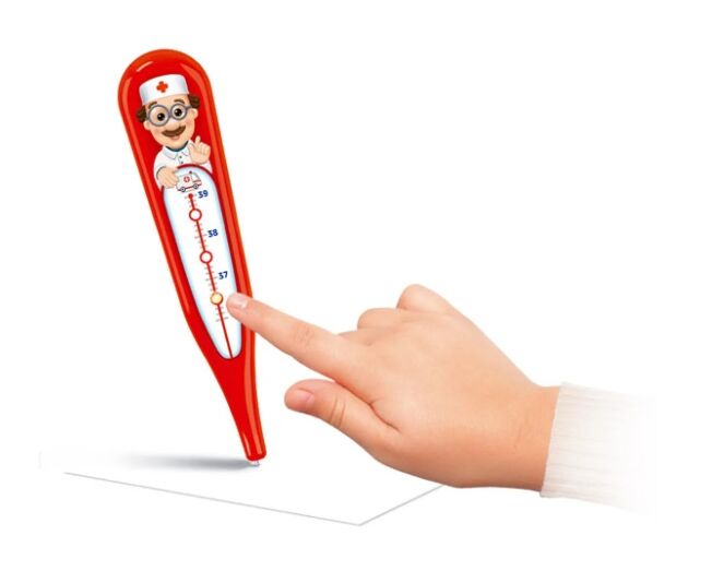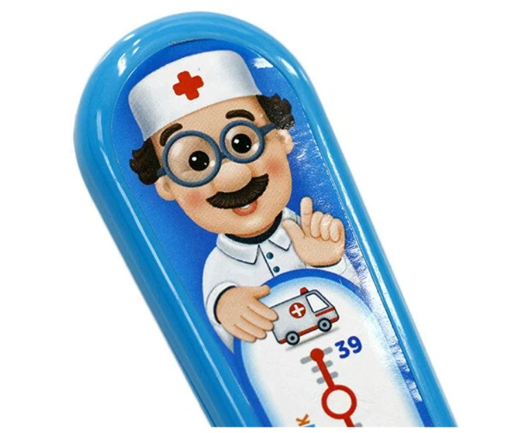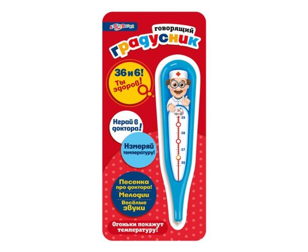 Электронная музыкальная игрушка из пластмассы с огоньками. С помощью этой необыкновенной игрушки ребёнок сможет почувствовать себя настоящими доктором. Говорящий градусник определит температуру и даст полезный совет – стоит только прикоснуться к плюшевому мишке или заболевшей кукле. А ещё малышу обязательно понравятся забавные мелодии («Собачий вальс», «Танец утят») и весёлая песенка про доктора!