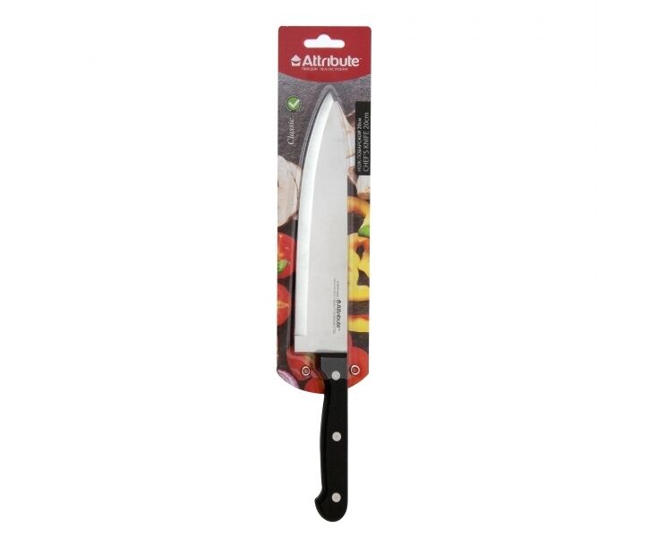 Нож кухонный поварской нерж. CLASSIC 20см (AKC128 ) Тип: кухонный нож. Назначение: универсальный. Материал лезвия: нержавеющая сталь. Длина лезвия, см: 20. Толщина лезвия, мм: 1.5. Материал ручки: пластик. Страна происхождения: Китай. Нож кухонный Attribute Classic поварской лезвие 20 см (AKC128). Нож кухонный поварской изготовлен из высококачественной нержавеющей стали. Рукоятка выполнена из пластика. Рукоятка не скользит в руках и делает резку удобной и безопасной. Этот нож также идеально шинкует, нарезает и измельчает продукты и займет достойное место среди аксессуаров на вашей кухне. Длина лезвия: 20 см. Не рекомендуется использовать в посудомоечной машине .